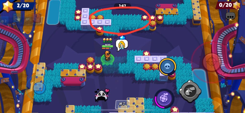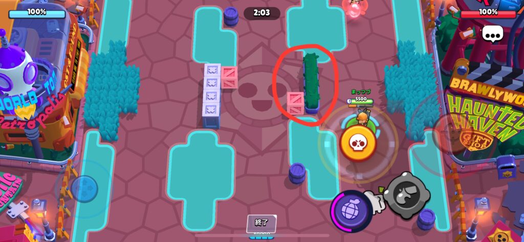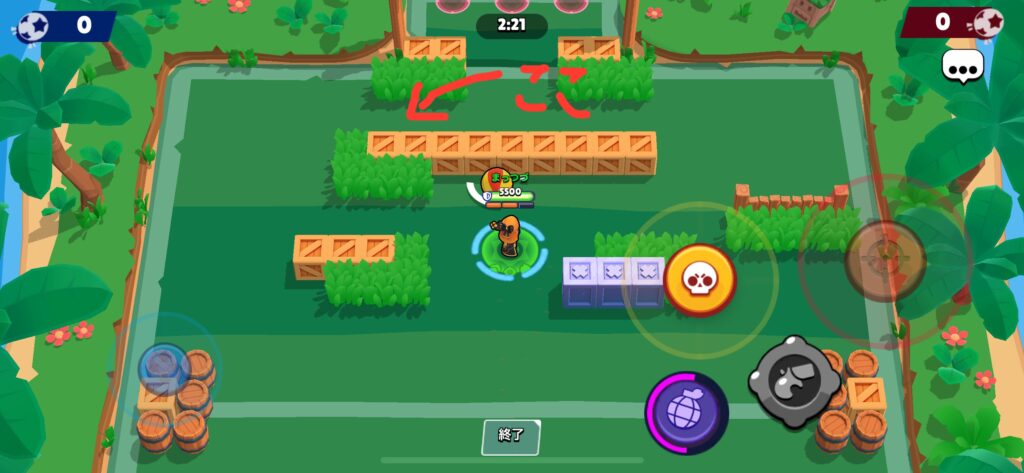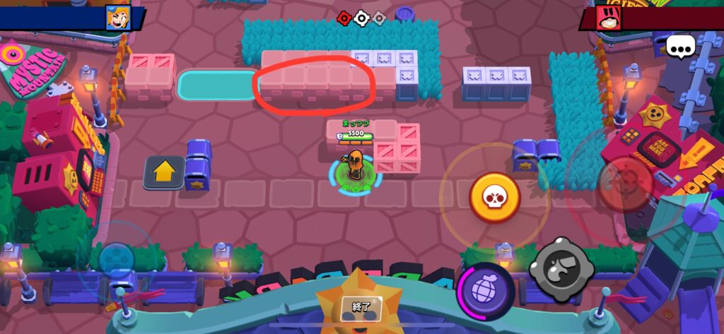赤い部分を壊すことで相手の隠れる場所がなくなり、カゼやキット、レオンといったキャラクターの奇襲を防ぎやすくなります。さらに射程の管理もしやすくなるので、とてもおすすめです。